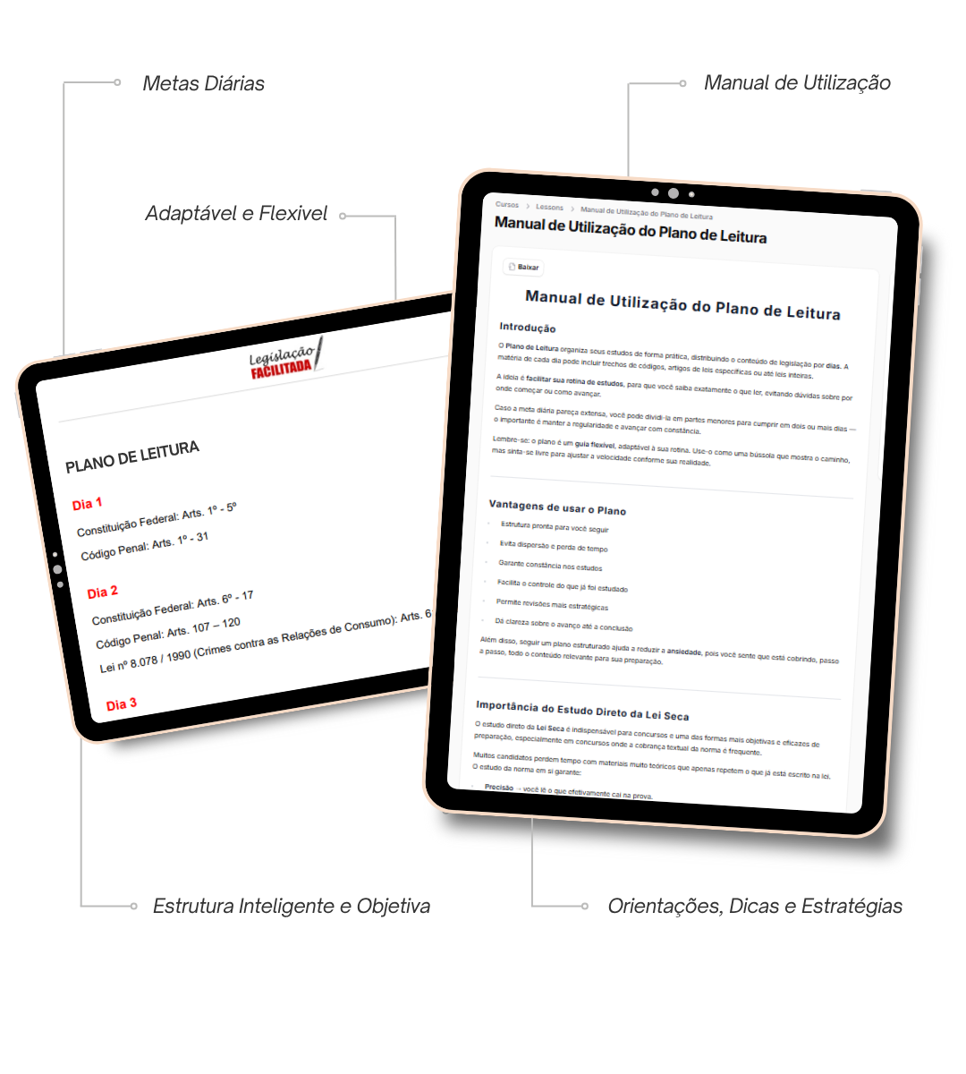 O Manual de Utilização do Plano de Leitura é um guia prático e flexível que orienta como organizar seus estudos de legislação com constância, foco e clareza. Ele explica a lógica do plano, as vantagens de seguir uma estrutura pronta, a importância do estudo direto da lei seca, as diferenças entre versões de planos, além de trazer dicas iniciais, formas de acompanhar o progresso, estratégias de revisão e renovação em ciclos. Com esse material, você terá um passo a passo confiável para estudar de forma organizada e estratégica até a prova.